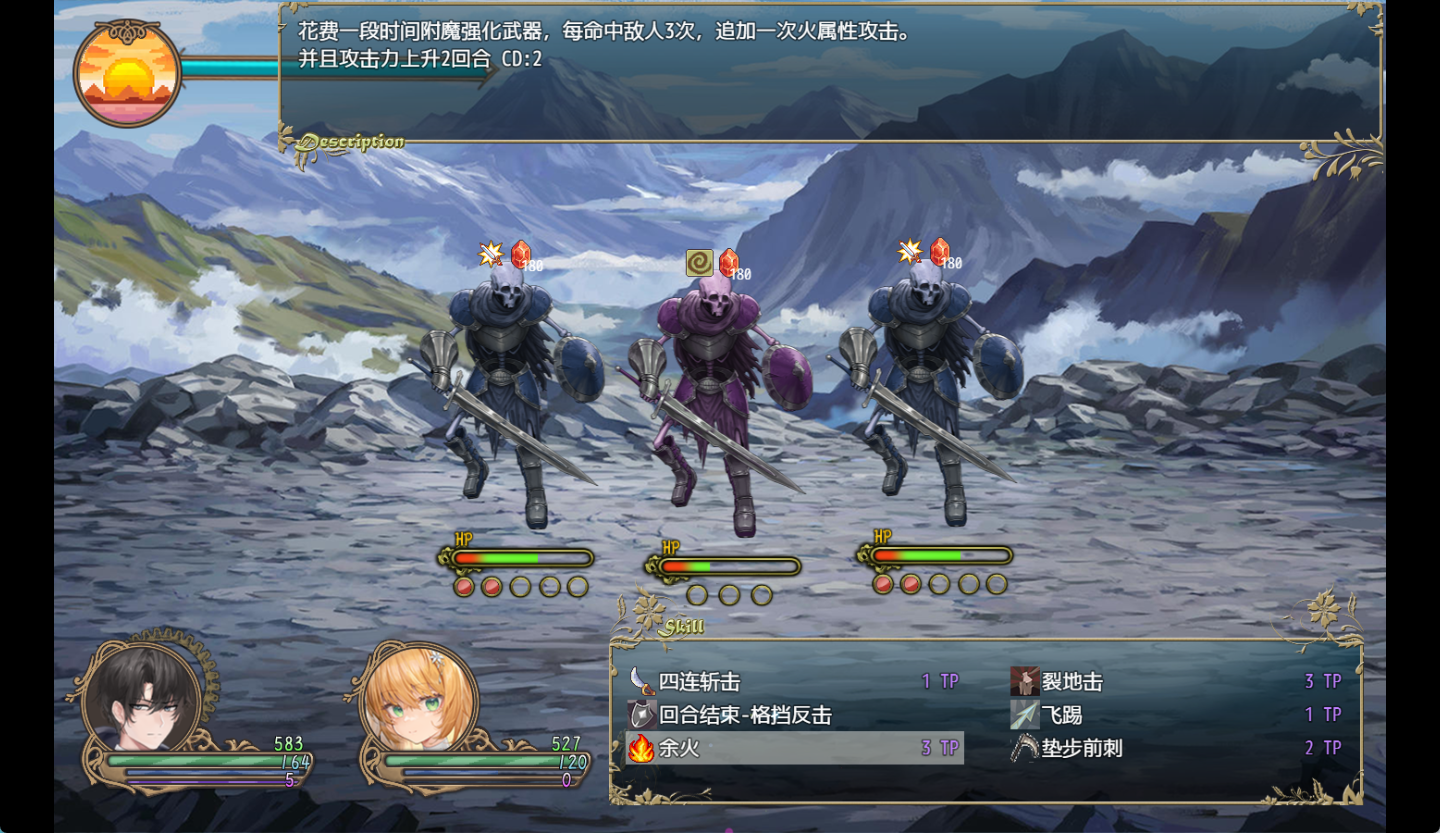 实际上,在上手这个战斗系统的前几个小时里,他所带来的惊喜与爽快是很流畅的。主角上BUFF,进攻,使用道具等交互行为都需要行动点,而女主则固定每一个回合能用一次道具和一次施法;男女主都按下回合结束后才会进入下一个回合。敌人则有血条(绿色条)和韧性条(红圆圈)两个状态,血条空后会死亡;韧性条空后就会进入瘫痪,并且打断敌人蓄力攻击的同时还会受到翻倍的伤害。男主没有韧性条,不过男主没血后会战败,游戏也没有血药,只有女主的技能恢复一些微薄的血量。好在游戏的每一把武器都有独特的技能模板,通过多样的正副手武器搭配能很轻松的击败BOSS。比如我常用的一个流派,左手冒火直剑,右手濡湿小镰刀。第一个回合妹妹用喷火筒加圣裁削韧上燃烧buff,主角用小镰刀破甲加为武器附加每三次攻击附加一次火焰攻击的buff。第二回合妹妹用喷火筒破韧后,主角直接四连斩击一刀一刀燃烧刀,砍死BOSS。