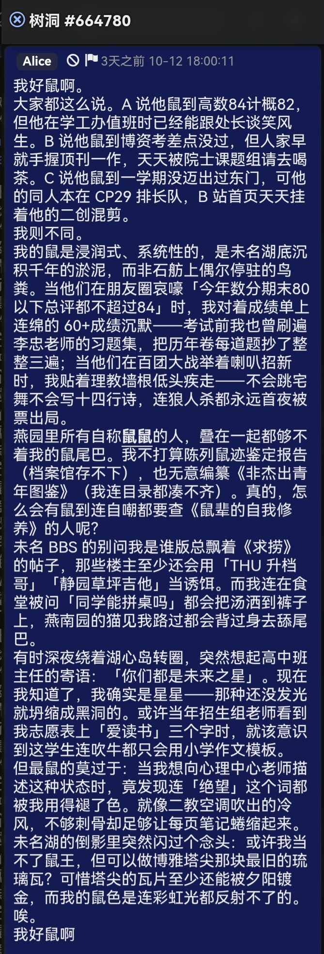 感觉并没有过上自己以前想的那种昂扬,青春的大学生活,在一个男女比十二比一的书院也基本没有恋爱的可能,日子不温不火,成绩不上不下,朋友不多不少。如此平淡的人生我拼尽全力进来的意义是什么呢?