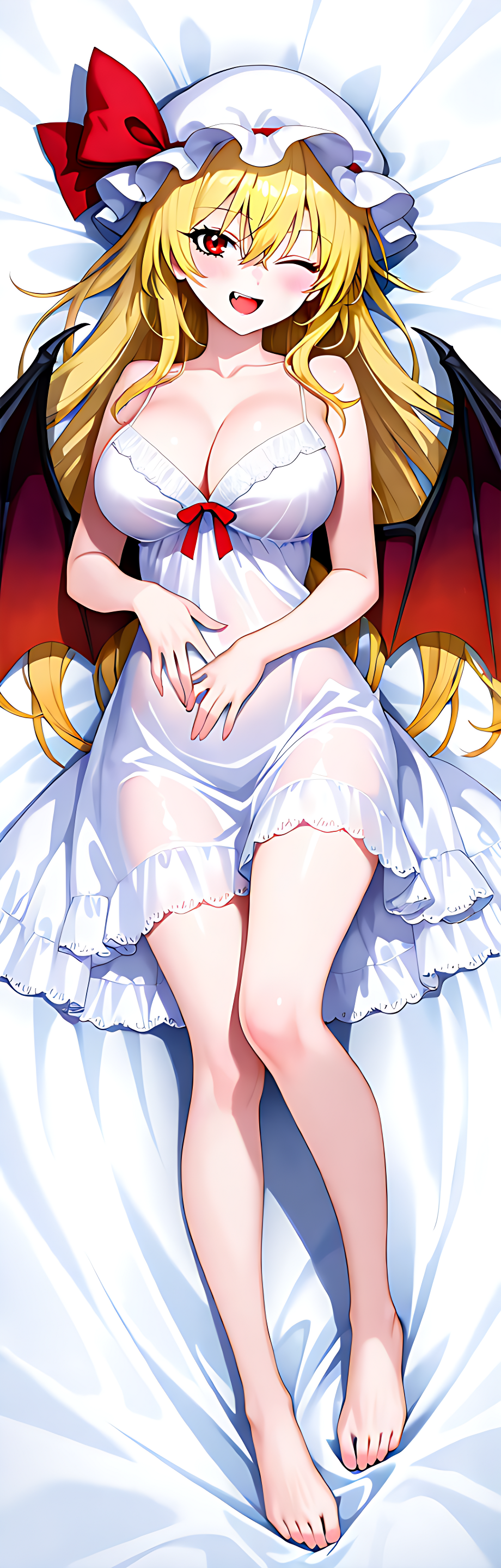 正面提示:best quality,official art,extremely detailed CG unity 8k wallpaper,girl,solo,bishoujo,cute face,pastel colors,soft lighting,hand-drawn feel,blush,sweat,up face,plan view:0.7,top view,(lie on the bed),(pleated white bedsheet background),hair between eyes,sheet_grab,full_shot,one eye 1girl,solo,ass,breasts,lying,dakimakura (medium),looking at viewer,on stomach,barefoot,full body,looking back,bed sheet,blush,bangs,feet,back,toes,from behind,on bed,soles,legs,shoulder blades,bishoujo,hair between eyes,one eye closed,vampire,fair_skin,petite,slender face,blonde hair,long hair,restrained,red eyes,(bat_wings),white headwear,red bow on hat,mob cap,(white nightgown),big breasts,transparent,ass,open_skirt,(white_background),nude,arms_up,