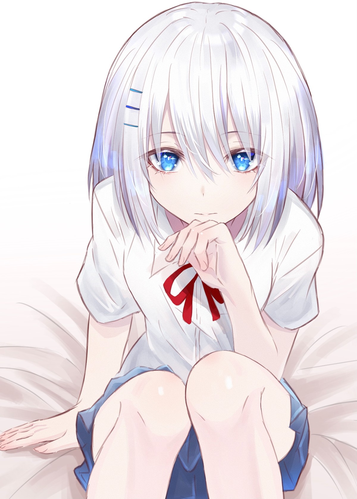 然而,预想中的“突袭”并未发生。站在他床边的鸢一折纸,穿着一身堪称典范的、清新而普通的日常服饰。一件纯白色的棉质女士衬衫,纽扣规规矩矩地系到领口,袖口整齐地挽至小臂;下身是一条过膝的浅灰色百褶长裙,面料垂顺,没有任何花哨的装饰;脚上是一双干净的白色长袜和相当平凡的平底鞋。她整个人身上找不到任何可以称之为“可疑”或者能够被曲解为“暗示”的要素,干净、清爽得像夏日清晨的第一缕微风。