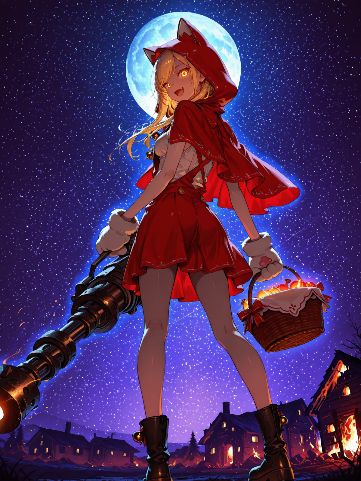 1girl,solo,bishoujo,golden eyes,glowing eyes,cat ears,long hair,jingle bells,blonde hair,swept bangs,tsurime,cute face,medium breasts,red animal hood,red capelet,red overall_skirt,white sleeveless_dress,white paw gloves,black boots,candy basket,:d,naughty_face,fang,standing,legs apart,late night,starry_sky,wind,huge moon,outdoors,burning house,dark,rim light,backlighting,purple theme,from below,from behind,looking_back,panorama,<lora:illustrious_masterpieces_v3:1>,masterpiece,best quality,very aesthetic,<lora:lightingSlider:-0.5>,<lora:il_contrast_slider_d1:-0.3>,<lora:il_saturation_slider_d1:-0.3>,<lora:err0rFv1.6:0.55>,err0rf,giant minigun,holding minigun in right hand,carrying the basket with left hand,<lora:Cool_Weapon_Design:1>,Weapon,cool weapon design,solo,1girl,