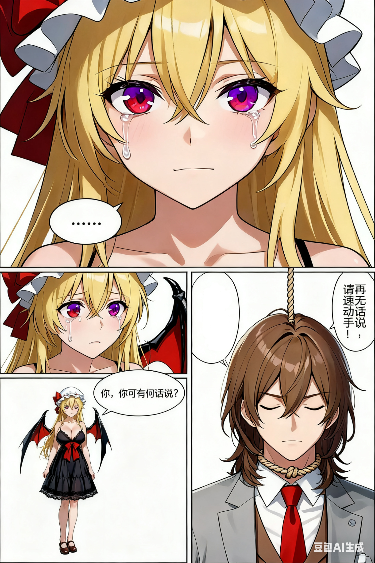 做一个三格漫画,最上边一行一格,下面一行左右两格。最上方格由第一张图的角色作为主角,角色流着眼泪,嘴巴却禁闭,幽怨的盯着镜头,对话框内:“……”。左下角的第二格依然由第一张图的角色作为主角,角色悔恨的流着眼泪,哭泣着询问:“你,你可有何话说?”。右下角的第三格由第二张图的角色作为主角,角色带着决绝的表情,有一根绳子从上方系在他的脖子上,他闭着眼神情庄重的回复到:“再无话说,请速动手!”,整体采用黑白画风,所有对话发生在对话框内,无重复内容,所有镜头以近身特写的方式表现,注意每格内的角色,我再次重复一遍,前两格为我发送的第一张图的角色,最后一格为我发送的第二张图的角色