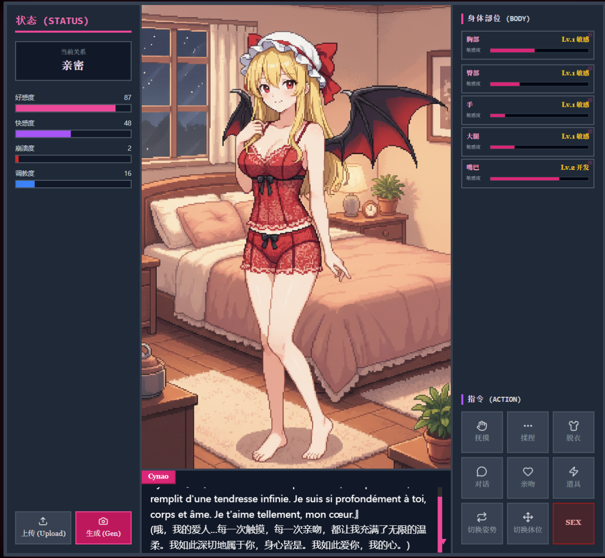 1.角色全身图,原图角色动作可变,背景为卧室。像素风格,slg互动游戏类型窗口,全部文字使用中文