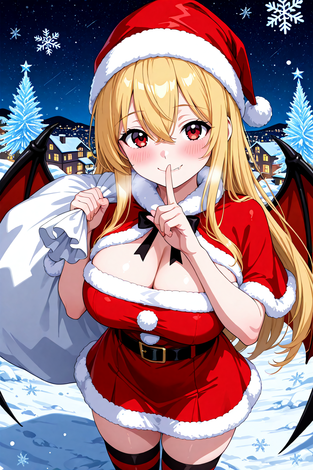 让图1人物躺下来,被包裹在圣诞礼盒里。人物丝带裹身,露出肩膀、胸口、腰部和大腿,嘴叼着丝带的一头。附带一张贺卡,上面写着“Merry Christmas!"。保持画风以及保持人物在生日礼盒里,礼盒里有圣诞元素。人物在内部蜷缩成一团。保持人物体型比例不变。保持人物头型和装饰不变